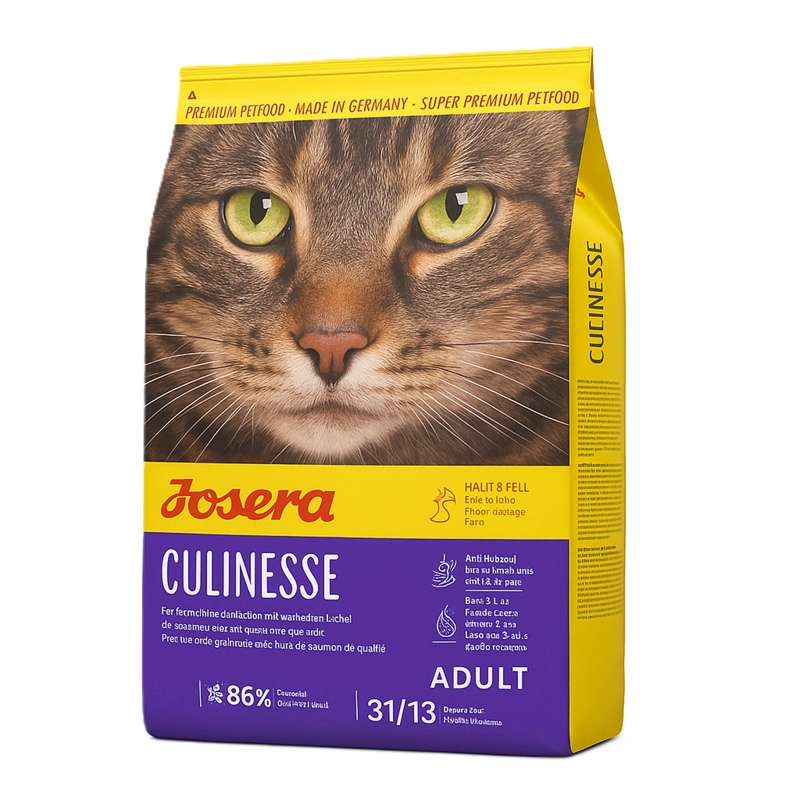 غذای گربه جوسرا Culinesse مخصوص گربه‌های بالغ خوش‌اشتهاست و با ترکیب مرغ و سالمون طعمی لذیذ و قابل‌هضم دارد. این غذا به کنترل pH ادرار و جلوگیری از تشکیل سنگ‌های ادراری کمک می‌کند. سرشار از اسیدهای چرب امگا ۳ و ۶، روی و مس برای سلامت پوست و موی گربه است.