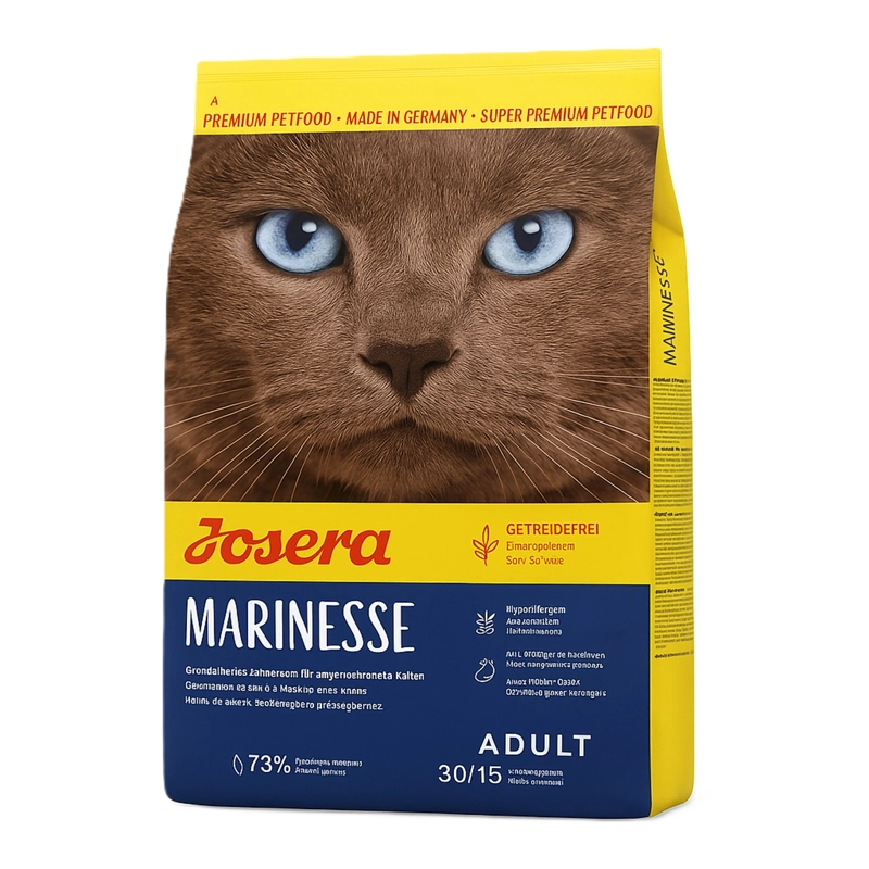 غذای خشک گربه Josera Marinesse با طعمی غنی از سالمون (حدود ۳۰٪) تولید شده، فاقد غلات بوده و برای گربه‌های حساس یا دارای عدم تحمل غذایی بسیار مناسب است. این محصول حاوی نسبت متعادلی از کلسیم و فسفر و میزان پایین منیزیم است تا pH ادرار را در محدوده سالم (~۶٫۰-۶٫۵) نگه‌دارد و خطر تشکیل سنگ‌های ادراری را کاهش دهد.