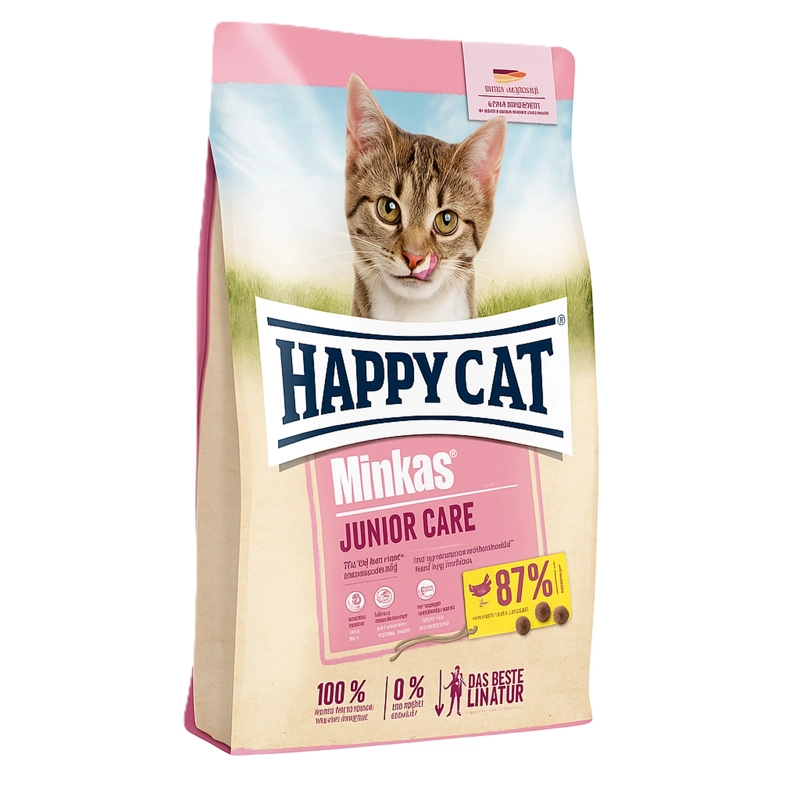 غذای خشک بچه‌گربه Happy Cat Minkas Kitten Care با پروتئین‌های حیوانی باکیفیت، اسیدهای چرب امگا-۳ و امگا-۶ و کروکت‌های کوچک برای رشد هماهنگ از حدود هفته پنجم مناسب است. این فرمول غنی‌شده با ویتامین‌ها و مواد معدنی است و سطح بوی مدفوع را با افزودن یوکا کاهش می‌دهد.
