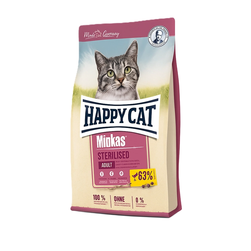 غذای خشک گربه Happy Cat Minkas Sterilised برای گربه‌های بالغ عقیم‌شده طراحی شده است؛ دارای چربی پایین (۹٪) تا کنترل وزن راحت‌تر باشد. ترکیب آن شامل حدّود ۸۳٪ پروتئین حیوانی از مرغ بوده و فاقد شکر افزوده است.